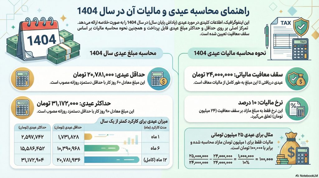 برای آشنایی بیشتر با مفهوم حداقل و حداکثر عیدی و نحوه محاسبه ده درصد مالیات مبلغ مازاد عیدی سال 1404 می توانید مقاله محاسبه عیدی کارگران را مطالعه کنید.